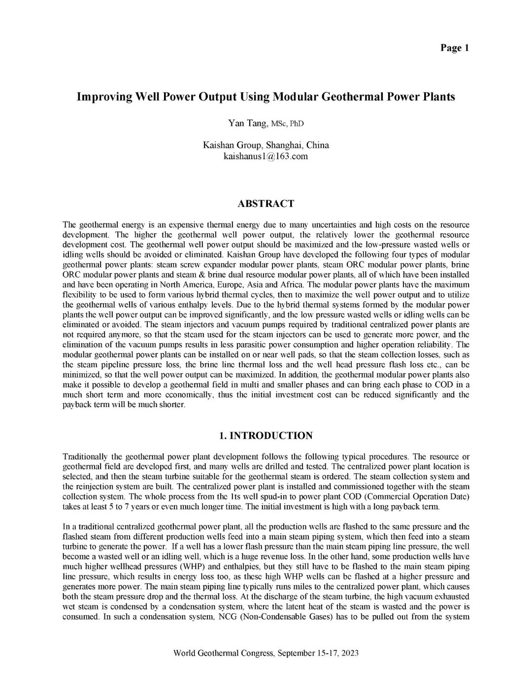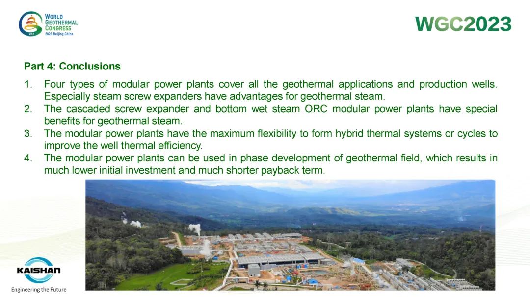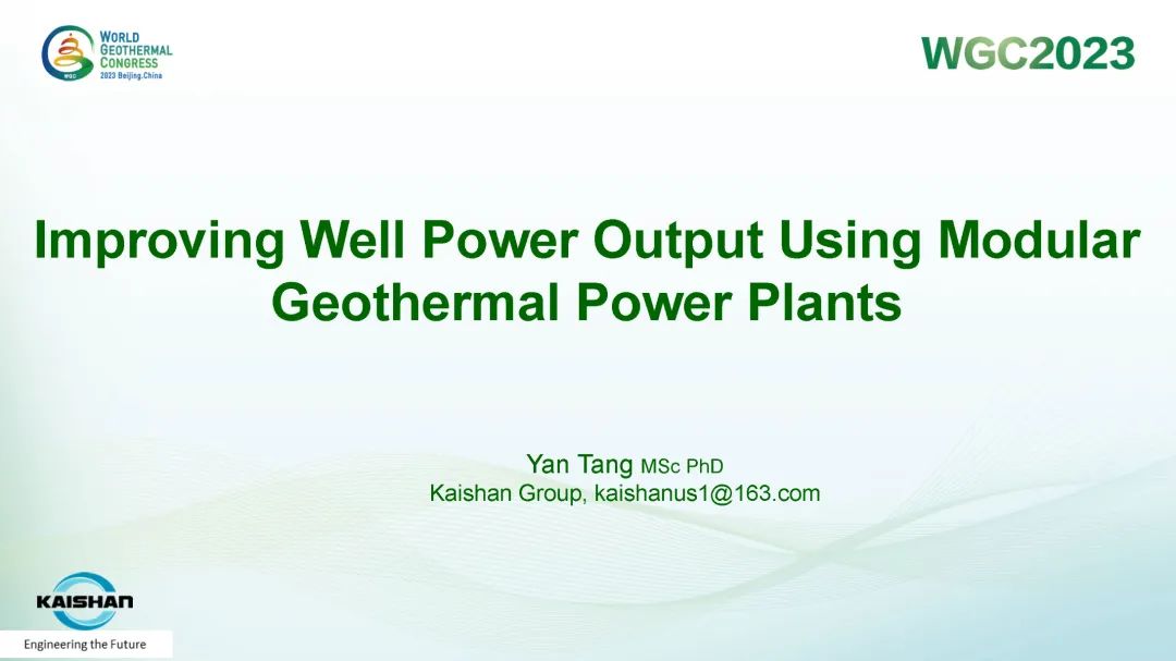 9月16日,公司总经理、开山地热井口模块发电技术创始人汤炎博士参加2023年北京世界地热大会(WGC),并受国际地热协会(IGA)首席执行官Marit Brommer女士邀请,做了题为《使用地热模块电站提高地热井产量》(Improving Well Power Output Using Modular Geothermal Power Plants)的专题报告。