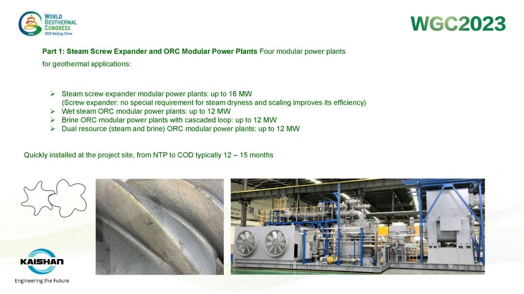 汤炎博士在报告中指出,地热开发应最大限度提高井的发电量,避免产生低压井或闲置井。开山成功开发的蒸汽螺杆膨胀机模块电站、蒸汽ORC模块电站、盐水ORC模块电站和“蒸汽+盐水”模块电站可根据不同温度、压力的地热资源提供最灵活、高效的热力循环系统,最大限度提高地热井功率输出。