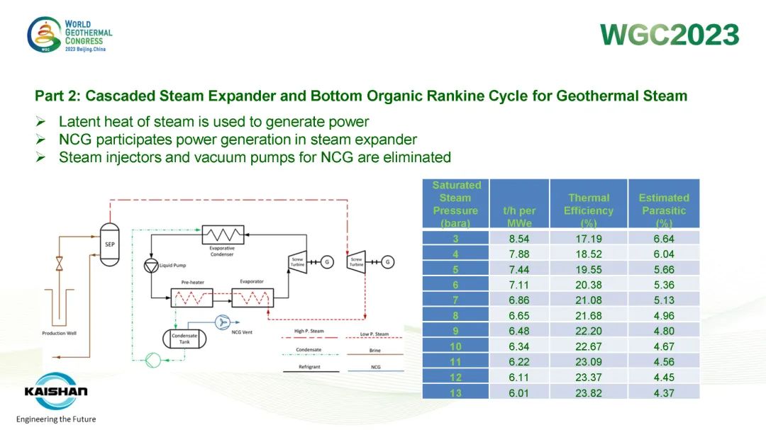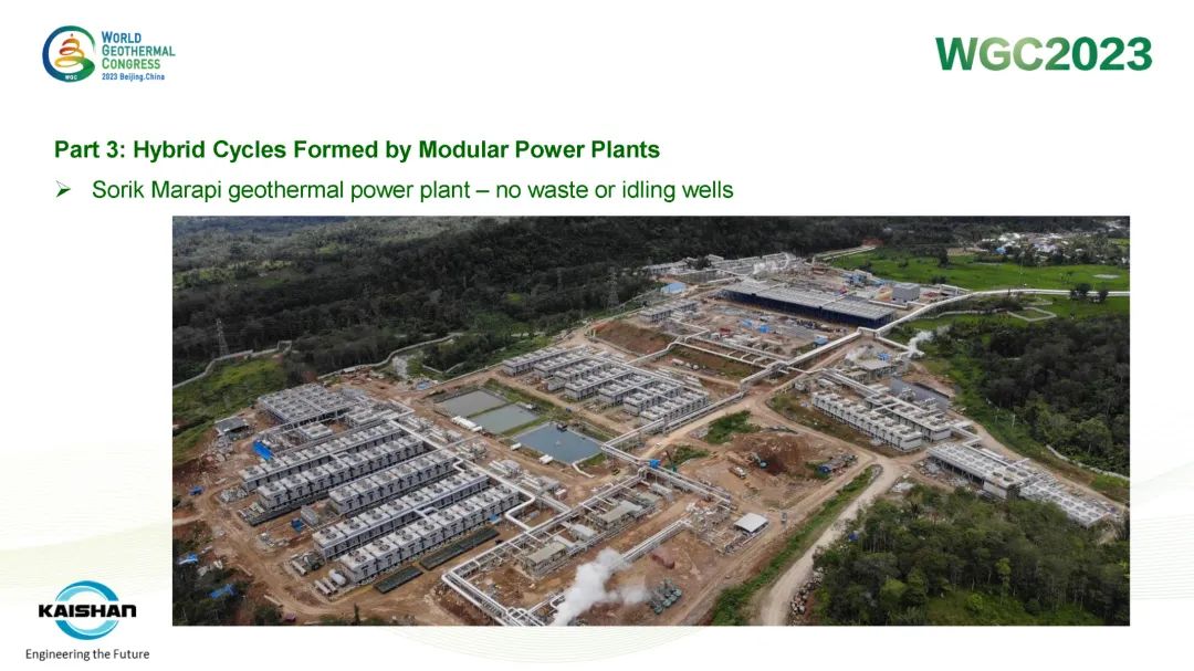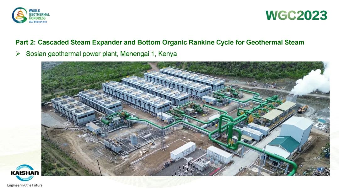 汤炎博士着重介绍了由开山EPC建设的肯尼亚Sosian-Menengai地热电站及开山自主开发、建设、运营的Sorik Marapi地热电站成功案例。Sosian-Menengai地热电站采用“蒸汽膨胀机+湿蒸汽ORC膨胀机”模块电站串级循环,无需采用传统中央电站分离不凝性气体的蒸汽喷射器和真空泵,从而降低了电站寄生负荷、提高其发电效率。Sorik Marapi项目是公司各类型模块电站的集大成者,高压蒸汽井、低压蒸汽井、热水井热源均可得到充分利用,进而使项目实现“无闲置低压/低温井”。模块电站“量体裁衣”式的解决方案通过提高井热效率改善了地热开发的经济性,也通过独树一帜地有效利用低压地热井及热水井,显著降低了资源钻探的单位成本。